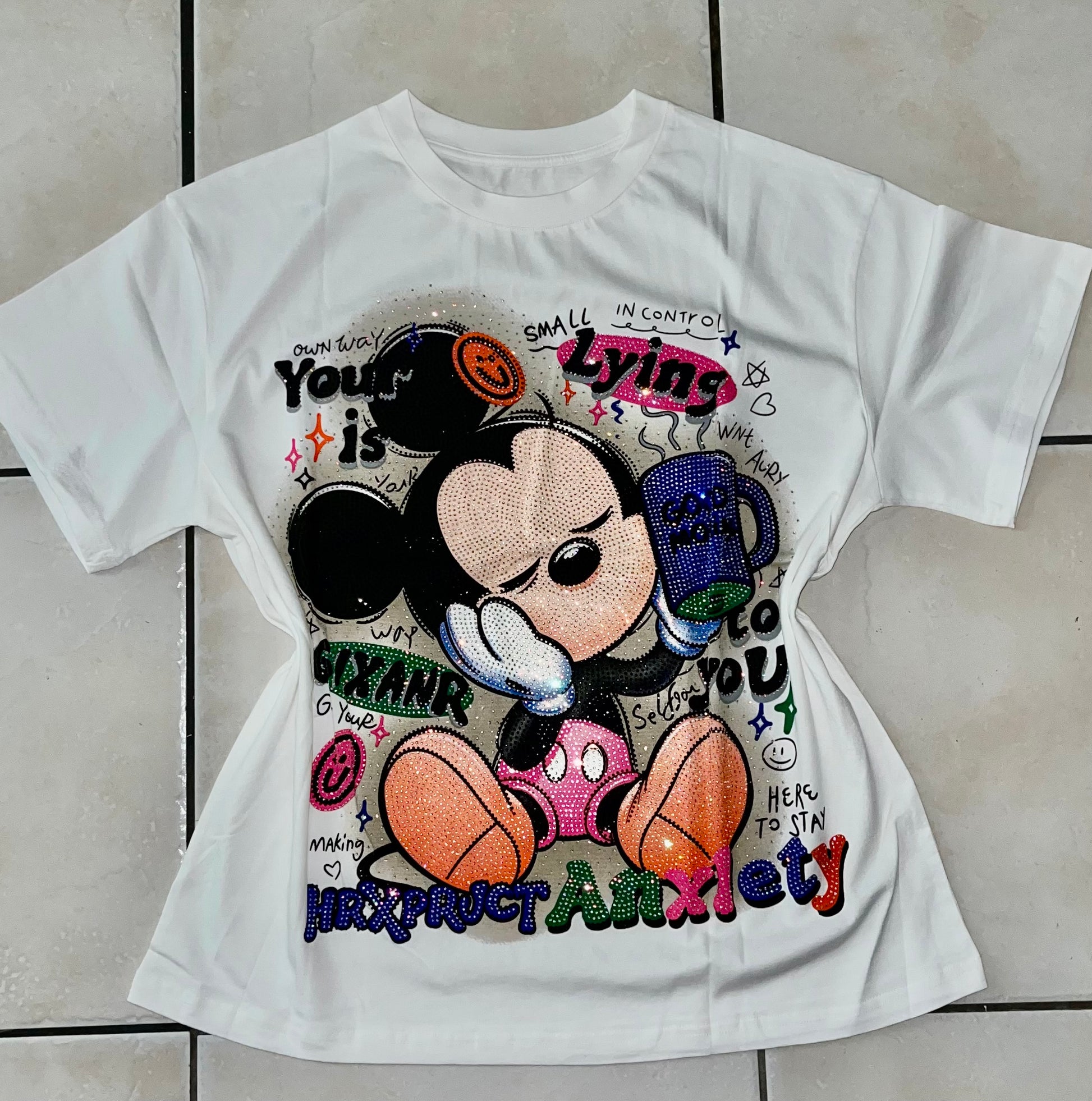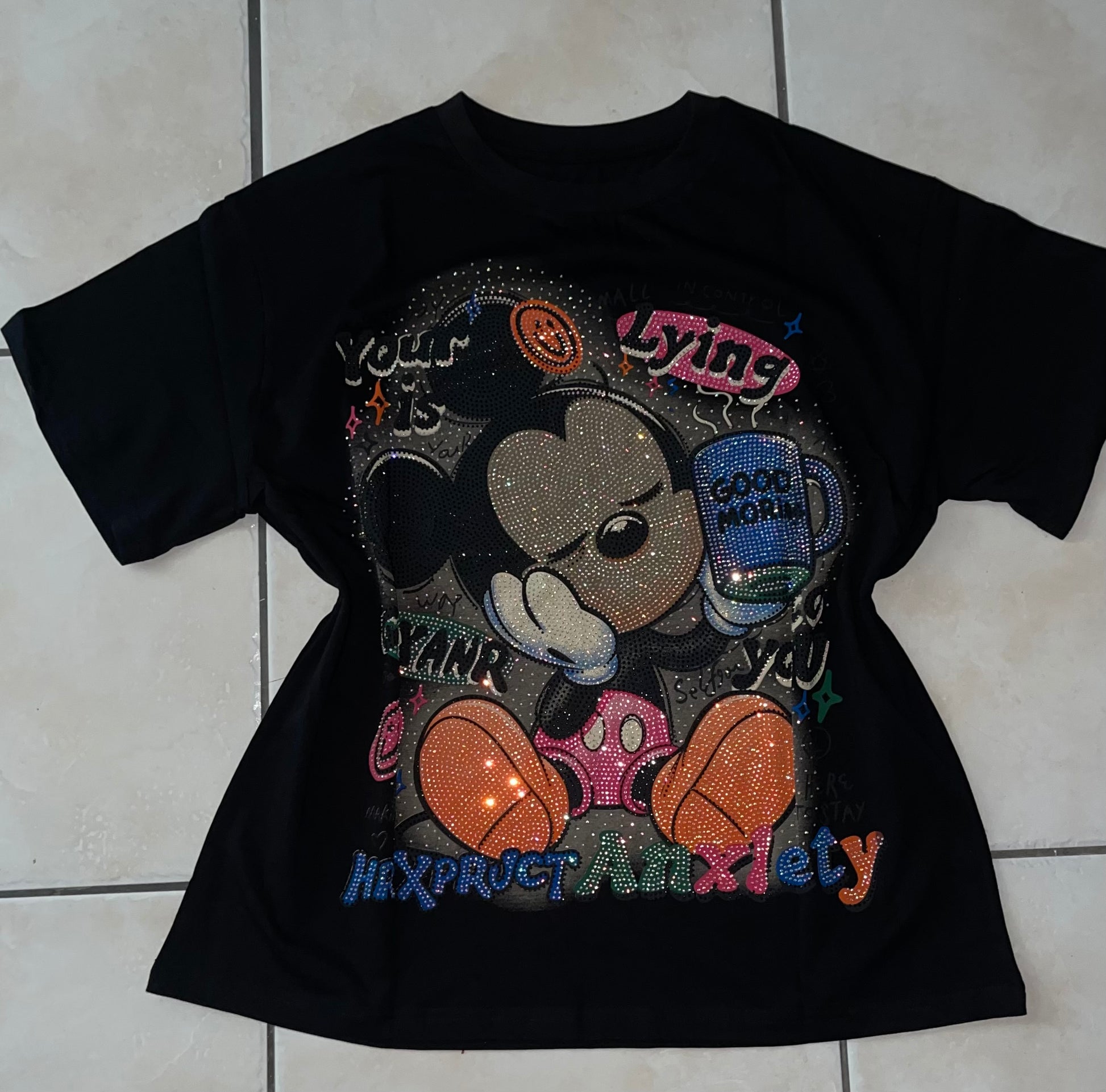 This one-size t-shirt features dazzling rhinestones, adding a touch of glamour to any outfit. The unique sizing allows for a comfortable and versatile fit for all body types. Expertly crafted for a flawless and sophisticated look.