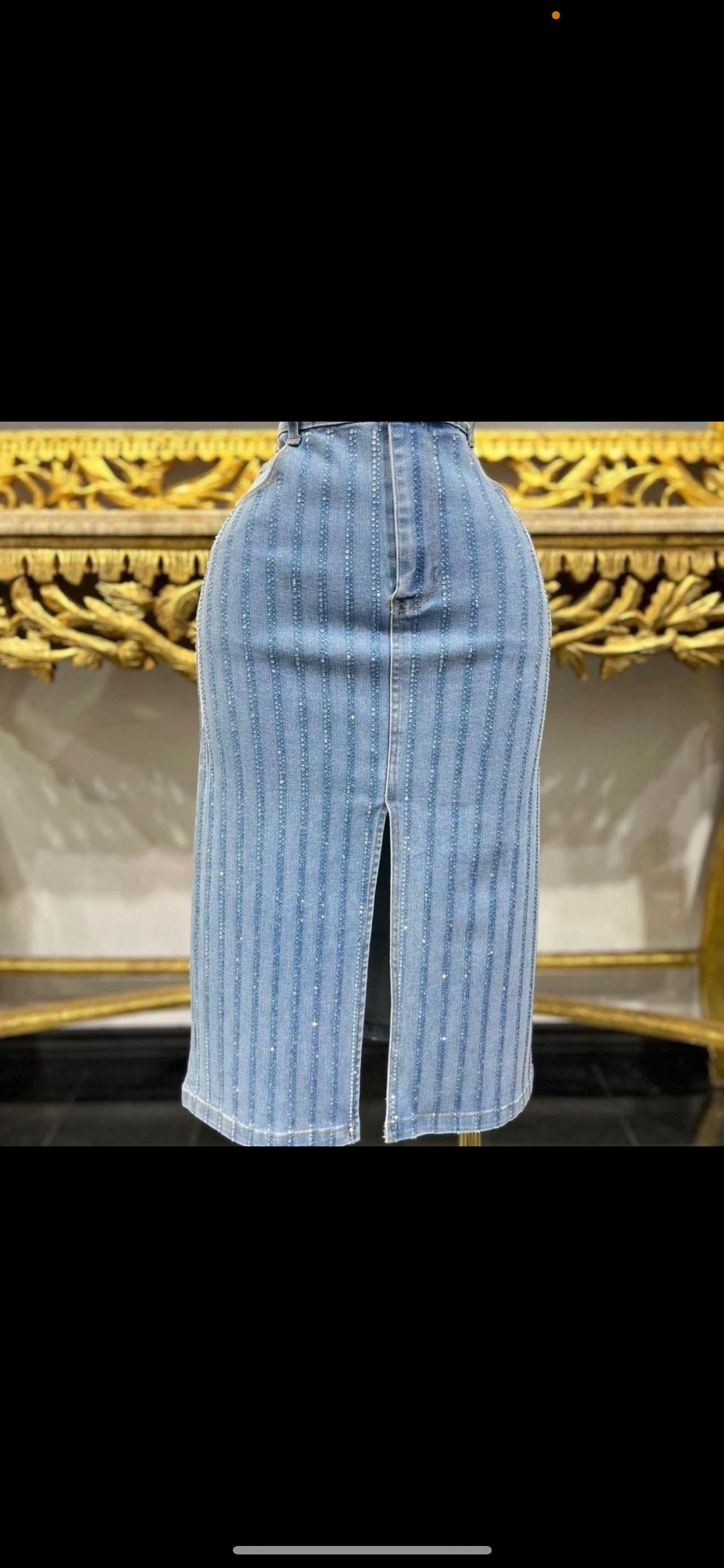 Upgrade your denim collection with our rhinestone adorned skirt. The perfect mix of statement and effortless, this denim skirt is guaranteed to elevate any outfit. Crafted from premium denim and embellished with sparkling rhinestones, it offers both style and comfort for any occasion.