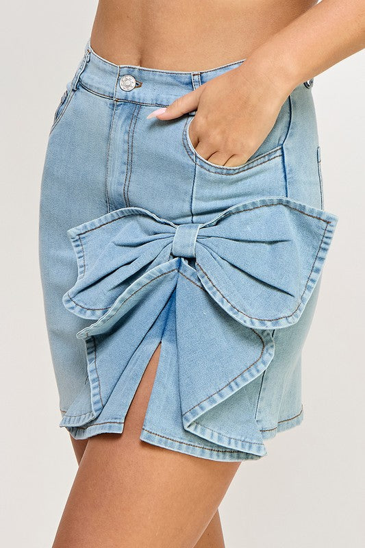 This denim skirt features a bow and short slit, adding a touch of femininity to your outfit. Crafted with high-quality materials, it guarantees durability and comfort.🦋🥰😍