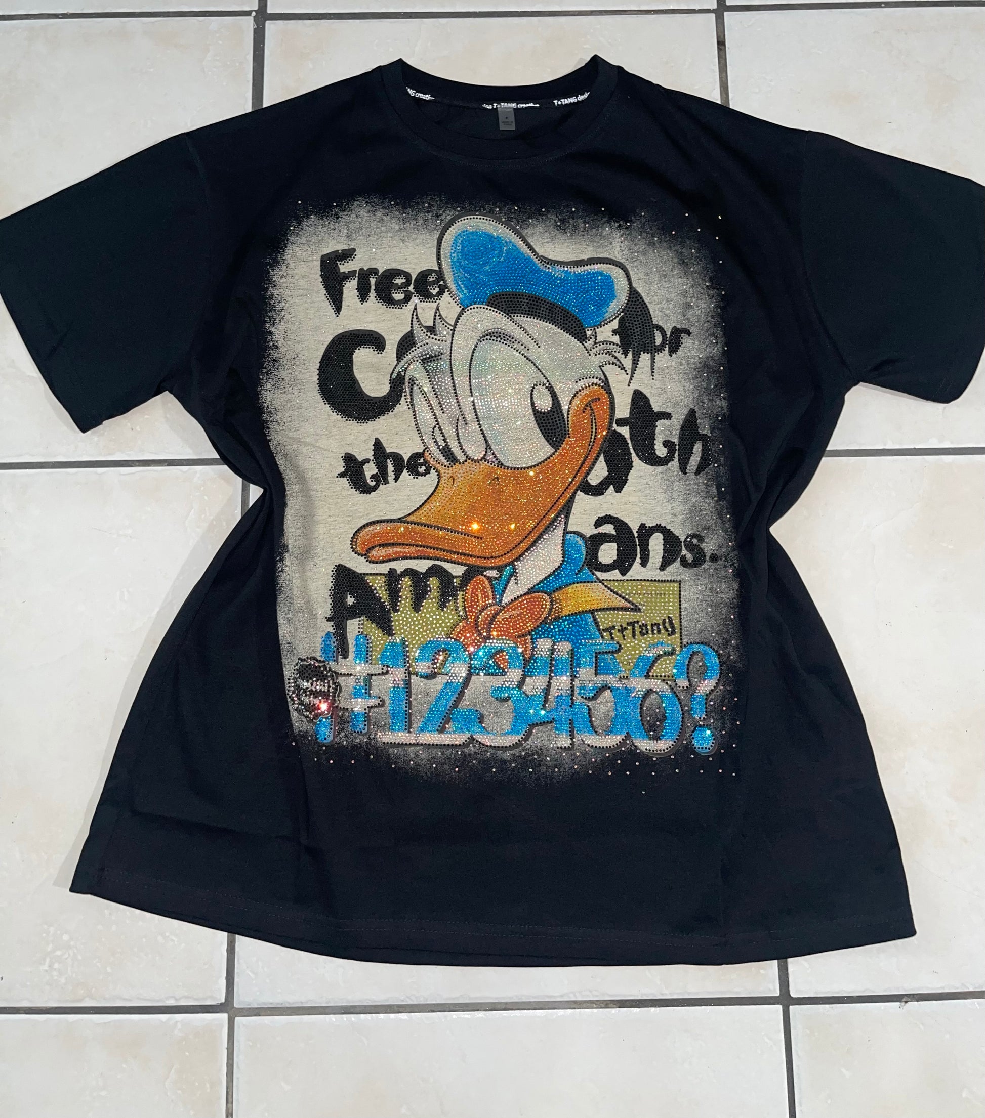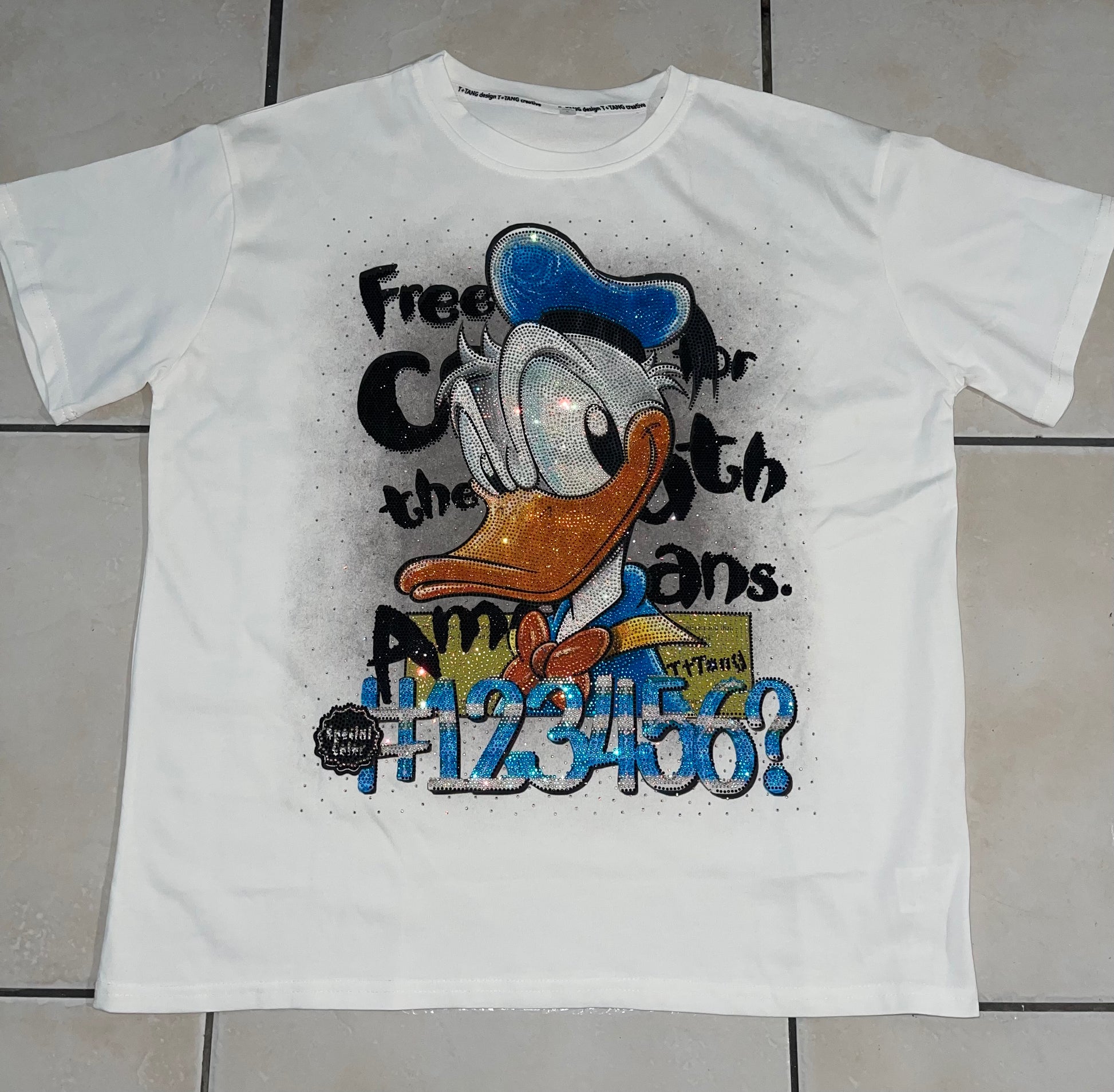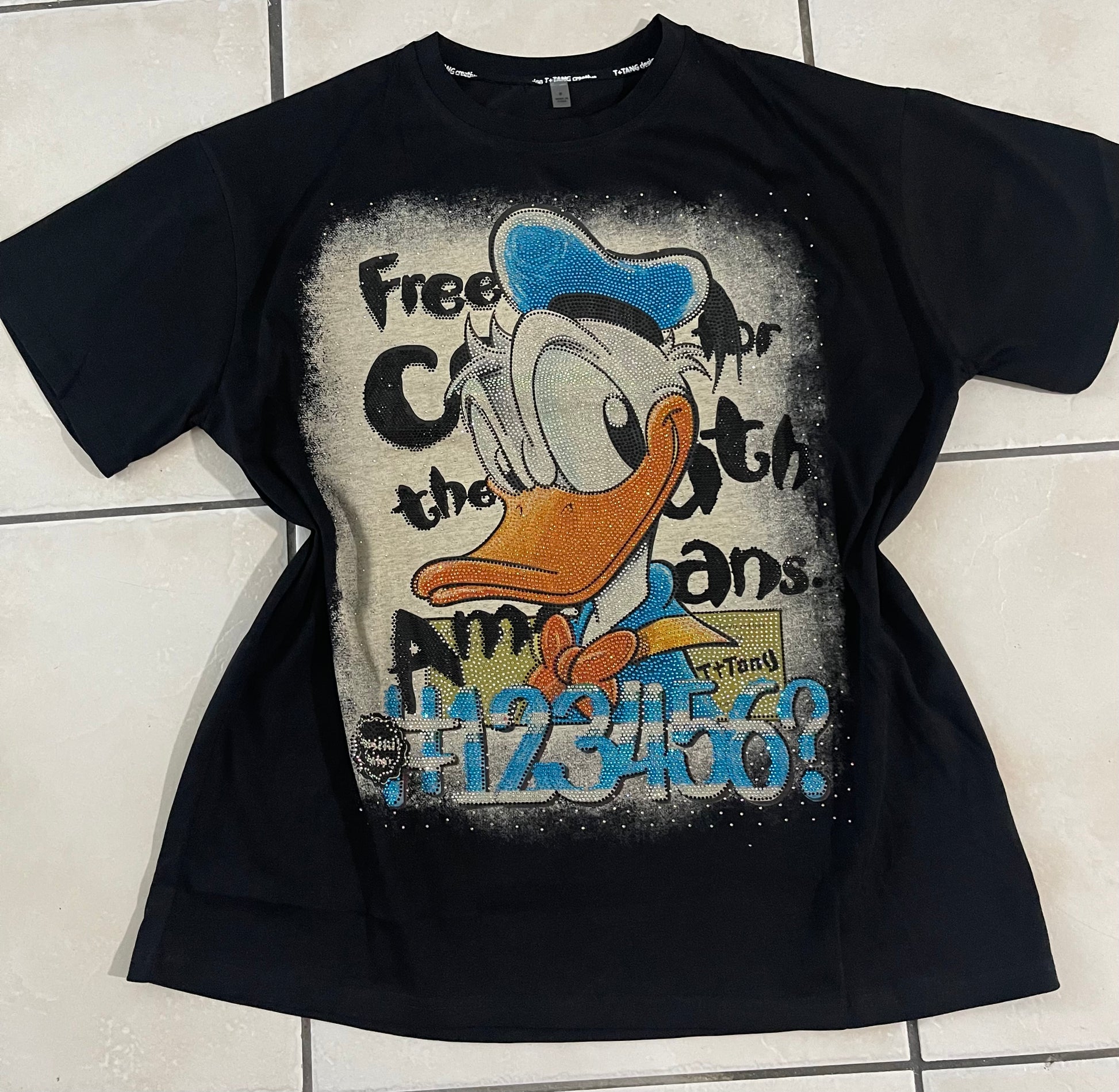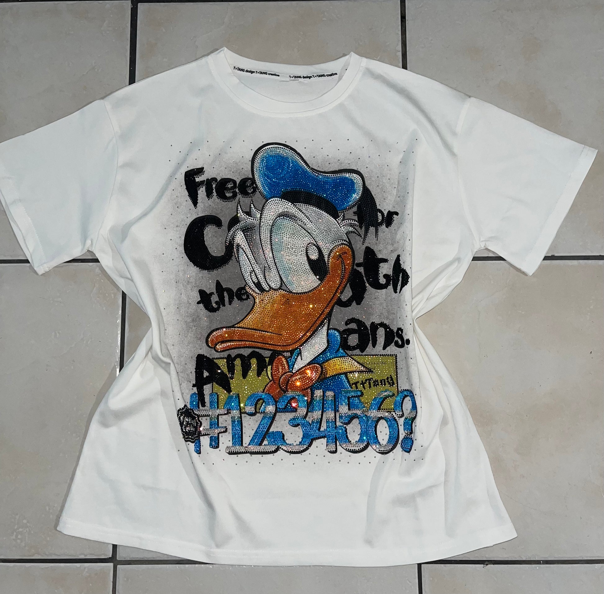 This beautiful shirt features a charming duck print and sparkling rhinestones, adding a touch of whimsy and shine to your wardrobe. Made with high-quality materials, it is perfect for any occasion and is sure to make you stand out from the crowd. Elevate your style with this unique and stylish shirt.